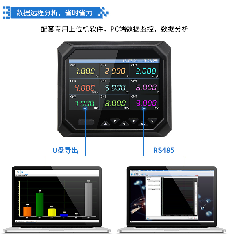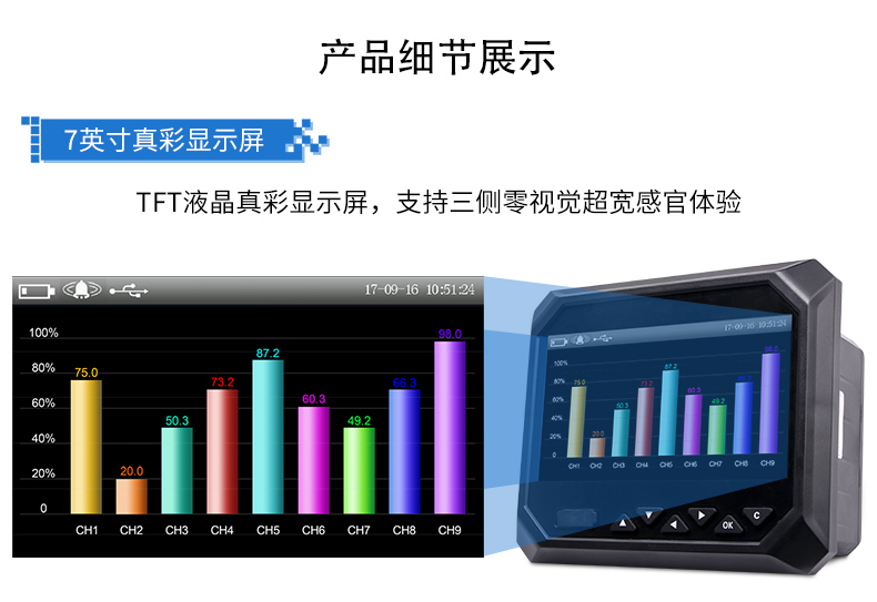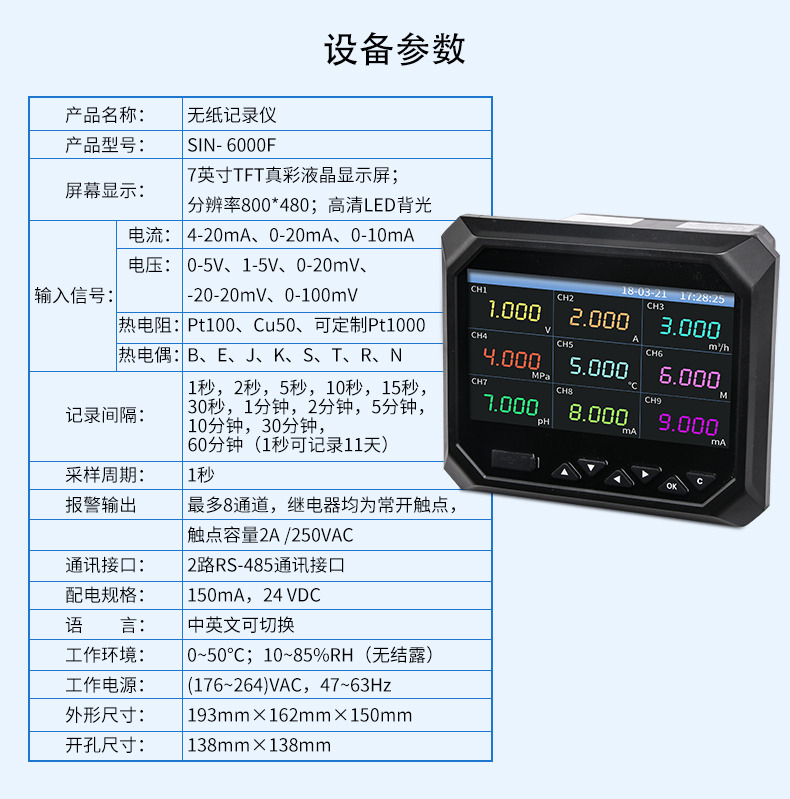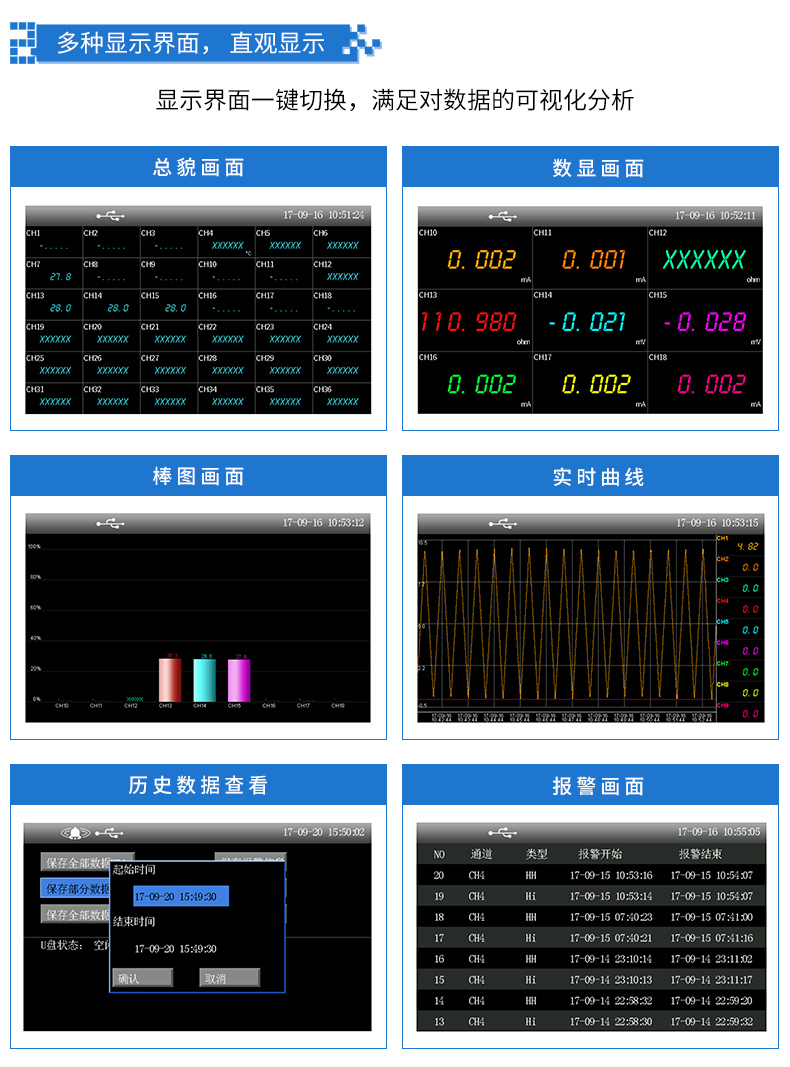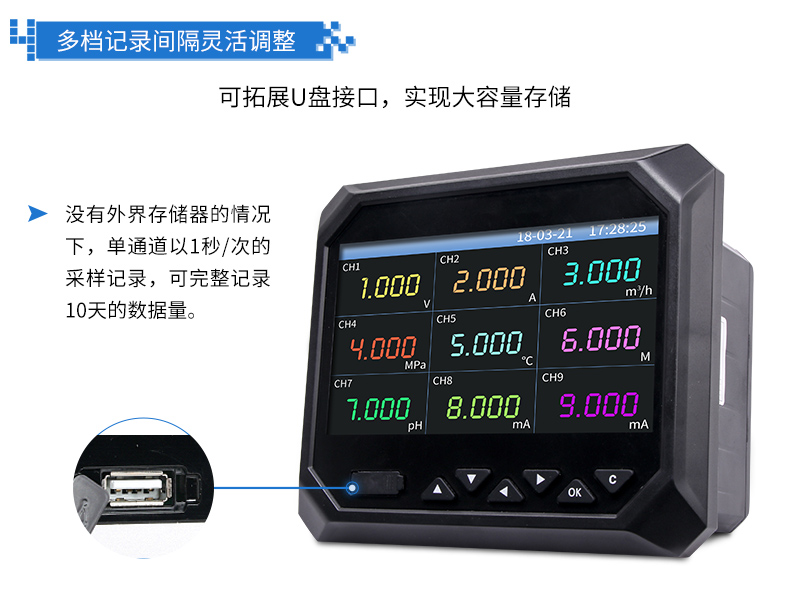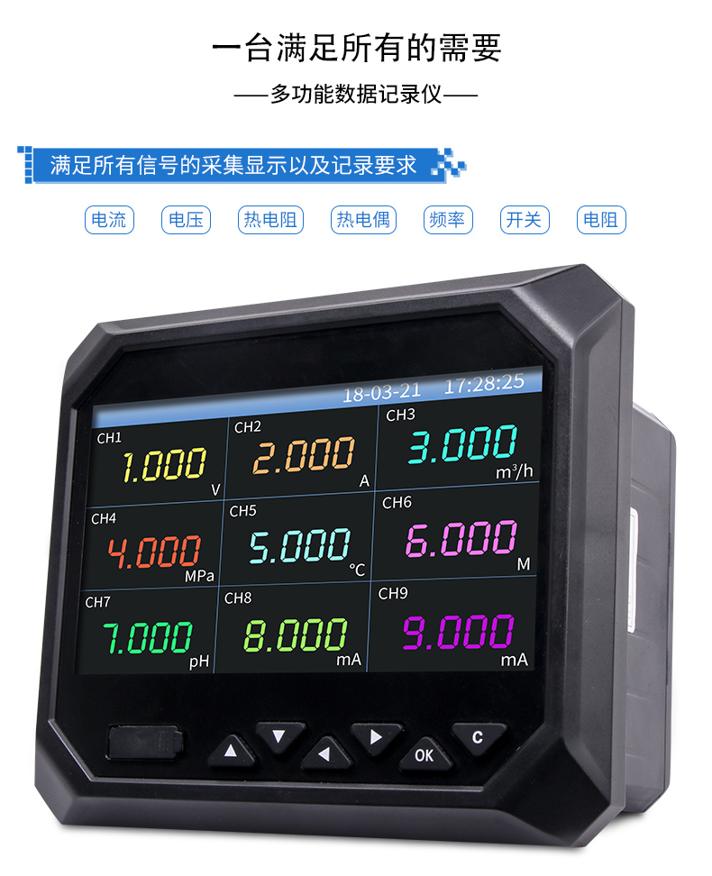 無紙記錄儀是將工業現場的各種需要監視記錄的輸入信號,比如熱電阻和熱電偶的溫度信號、流量計的流量信號、 壓力變送器的壓力信號等。通過高性能微處理器進行數據處理,一方面在高分辨液晶顯示屏幕上以多種形式的畫面顯 示出來,另一方面把這些監察信號的數據存放在儀表內部的大容量存儲芯片內,以便在儀表上直接進行數據和圖形查 詢、翻閱和打印。